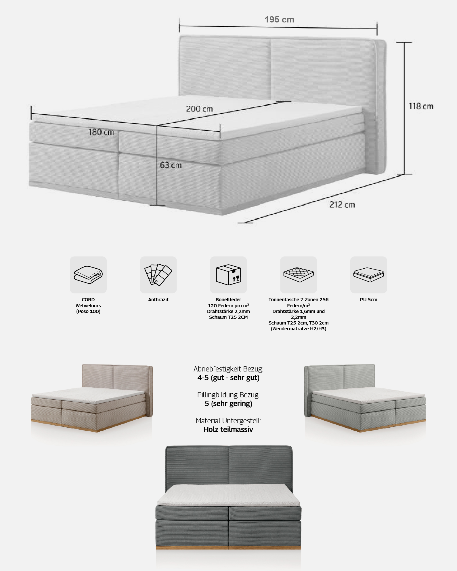 Besonders große und bequeme Liegefläche. Bezugsqualität: Hochwertiger Cord mit weicher Velours-Struktur